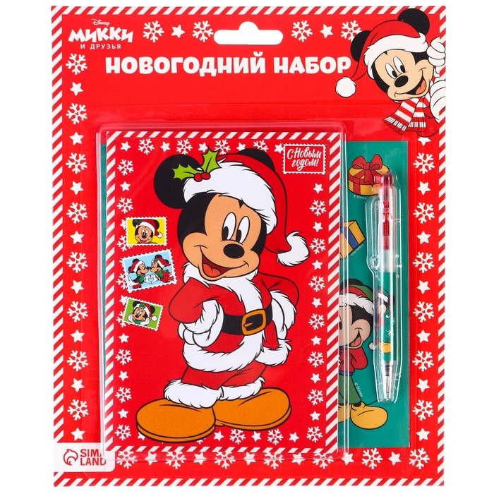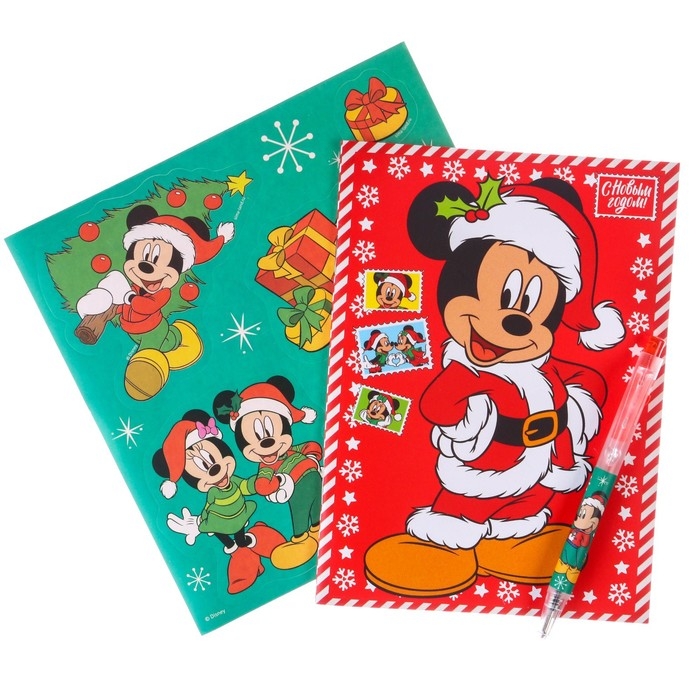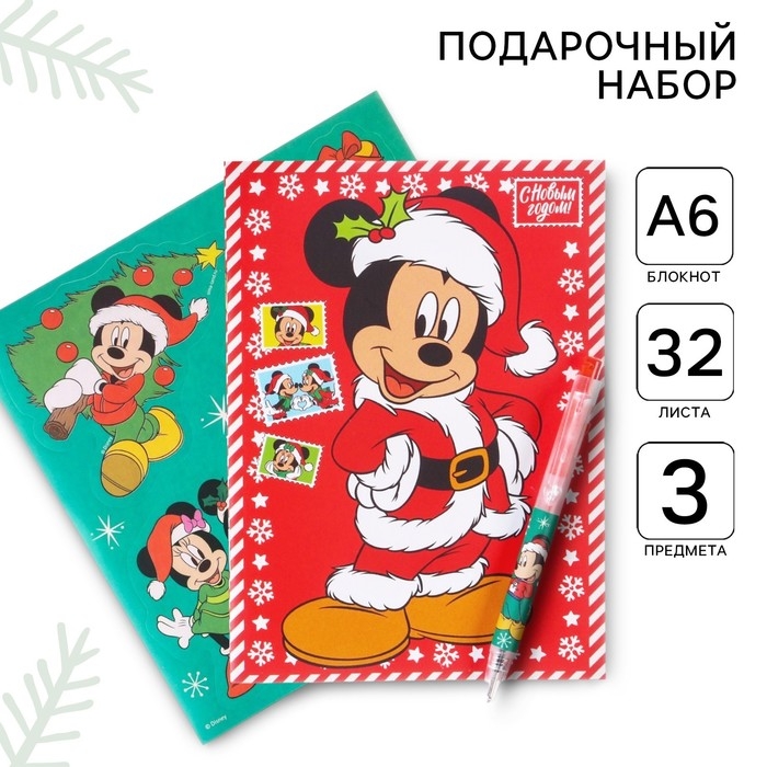 Новый год. Подарочный набор канцелярии "С новым годом", блокнот А6, ручка, наклейки, Микки Маус