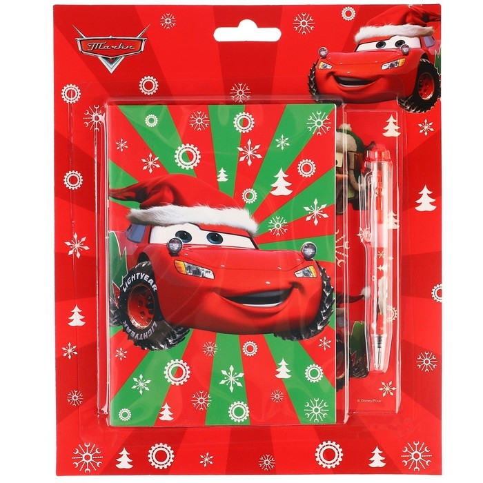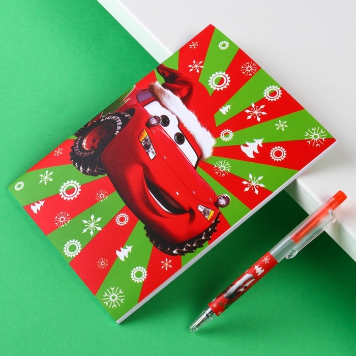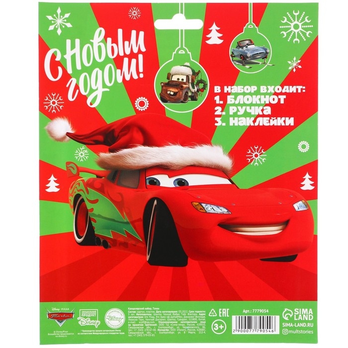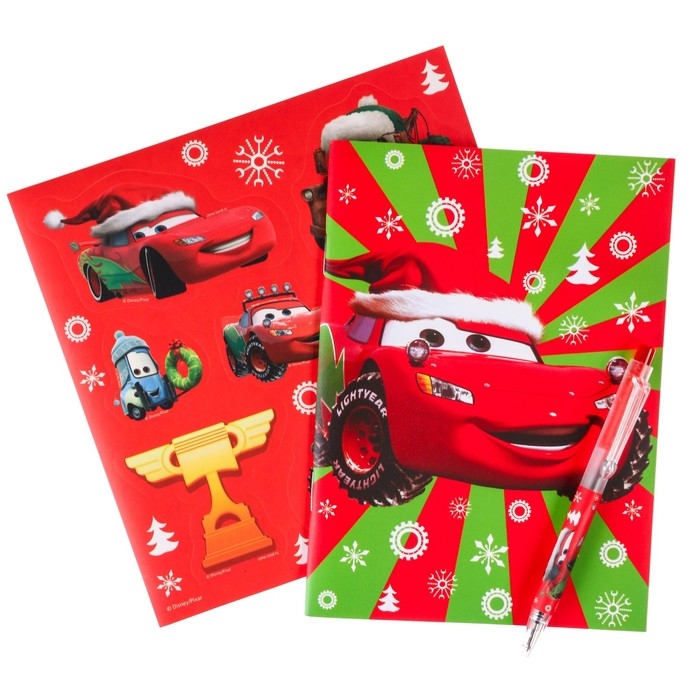Новый год. Подарочный набор канцелярии "С новым годом", блокнот А6, ручка, наклейки, Тачки