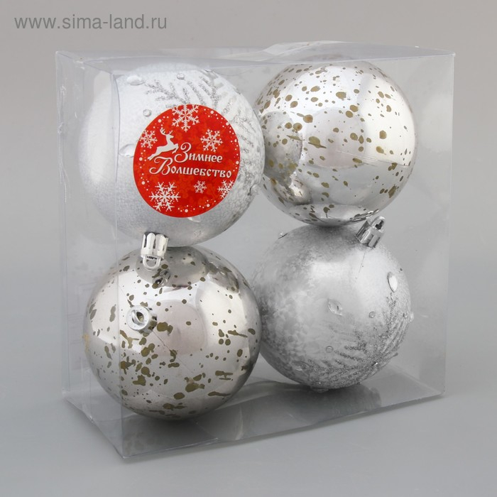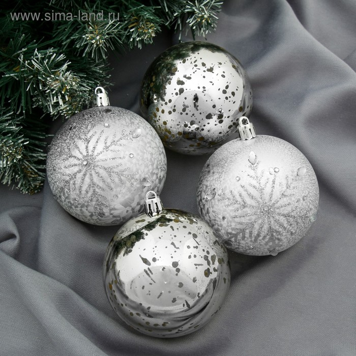Набор шаров пластик d-8 см, 4 шт "Кракле капель" серебро