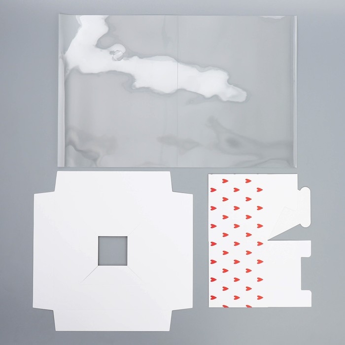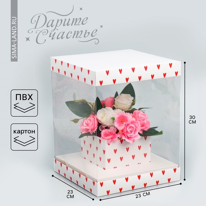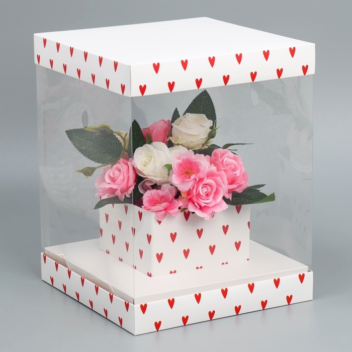 Коробка подарочная для цветов с вазой и PVC окнами складная, упаковка, «Сердца», 23 х 30 х 23 см