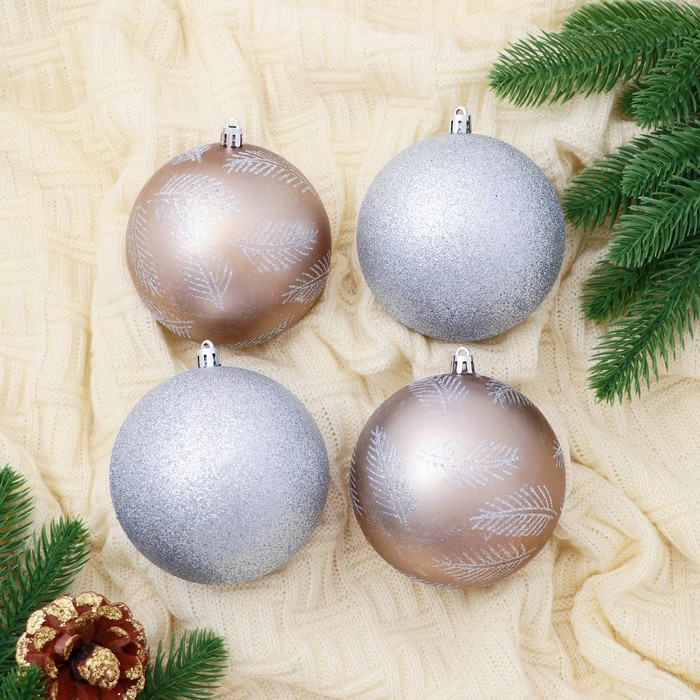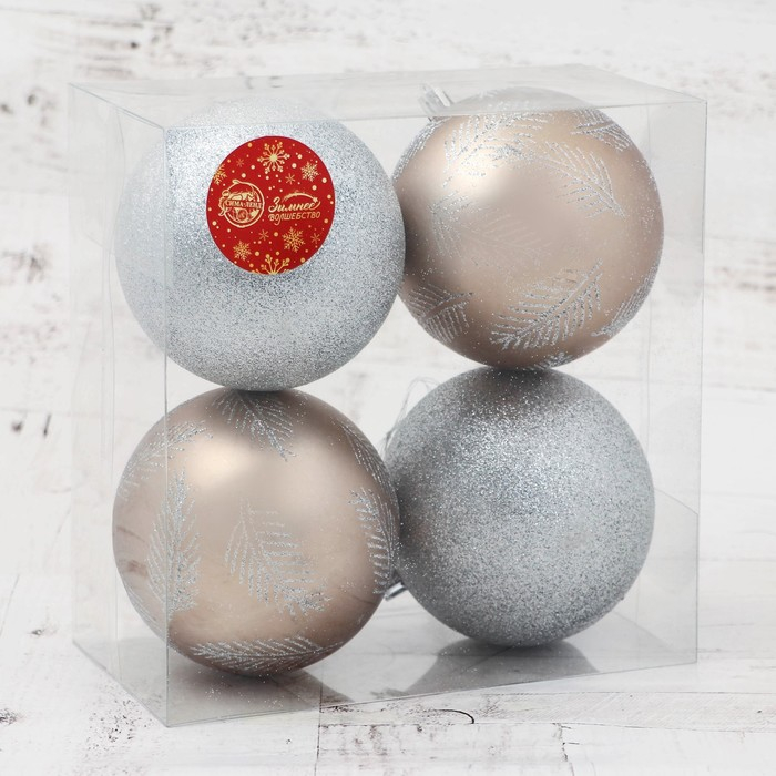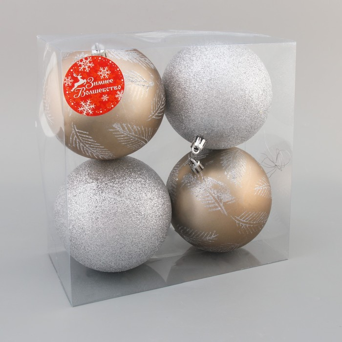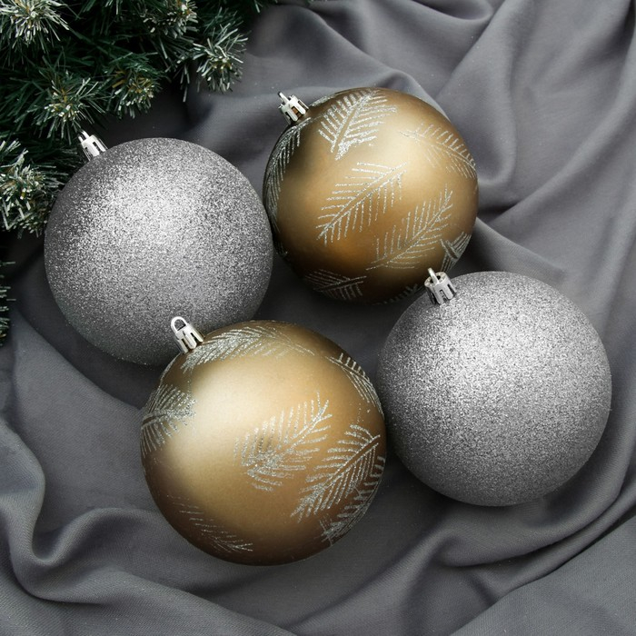 Набор шаров пластик d-10 см, 4 шт "Зимняя листва" серебро золото