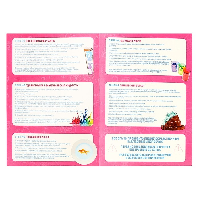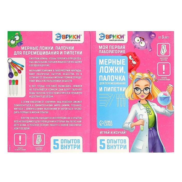 - Набор содержит инструкцию с подробным описанием к 5 экспериментам, мерные ложечки, палочку, пипетки и тематические наклейки.