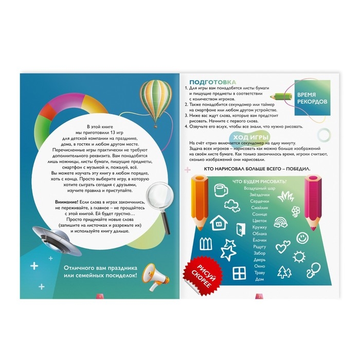 Просто открывайте книгу, выбирайте игру на сегодня и приступайте к веселью Вас ждут игры на объяснение и угадывание слов, на скорость, рисование и многое другое!