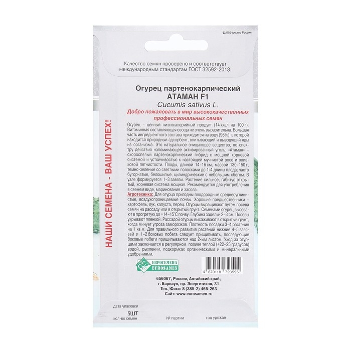 Семена Огурец партенокарпик Атаман F1, 5 шт