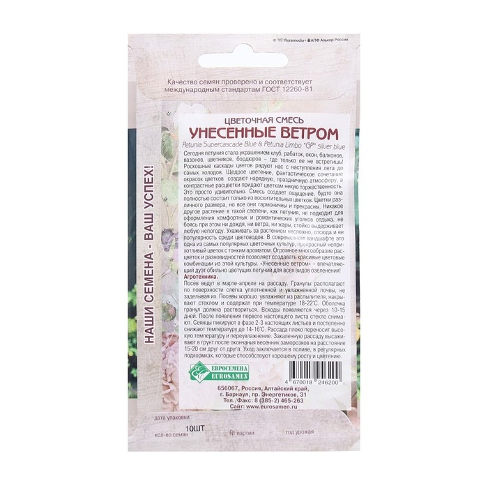 Сегодня петуния стала украшением клуб, рабаток, окон, балконов, вазонов, цветников, бордюров – где только ее не встретишь! Роскошные каскады цветов радуют нас с наступления лета до самых холодов. Щедрое цветение, фантастическое сочетание окрасок цветков создают нарядную, праздничную атмосферу, а контрастные расцветки придают цветкам некую торжественность. Это просто удивительно. Смесь создает ощущение, будто она полностью состоит только из восхитительных цветков. Цветки различного размера, но все они гармоничны и прекрасны. Никакое другое растение в такой степени, как петуния, не подходит для оформления комфортных и романтических уголков отдыха, не боясь при этом ни дождя, ни ветра, ни жары, стойко выдерживает любую непогоду. Ухаживать за растением несложно, отсюда и ее популярность среди цветоводов. В современном ландшафте это одна из самых популярных цветочных культур, прекрасный неприхотливый цветок с тонким ароматом. Огромное многообразие расцветок и разновидностей позволяет создавать красивые цветовые комбинации из этой культуры. «Унесенные ветром»-впечатляющий дуэт обильно цветущих петуний для всех видов озеленения!