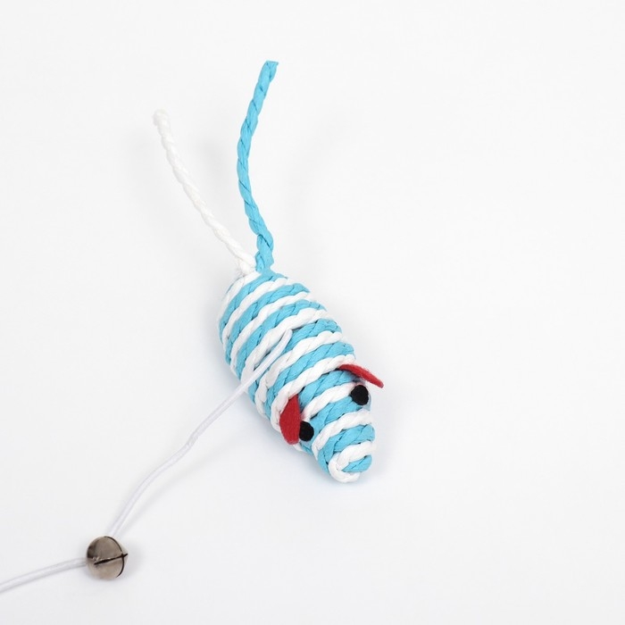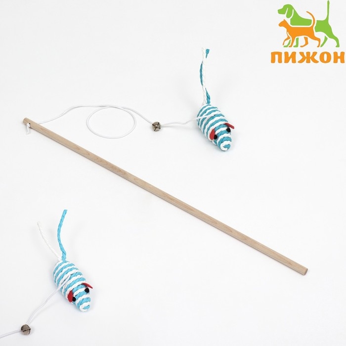 Дразнилка-удочка с мышью на деревянной ручке, голубая/белая
