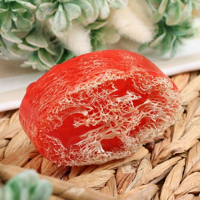 Мыло с люфой одновременно очищает кожу и скрабирует её. Это натуральное экологичное средство гигиены не вызывает аллергии.