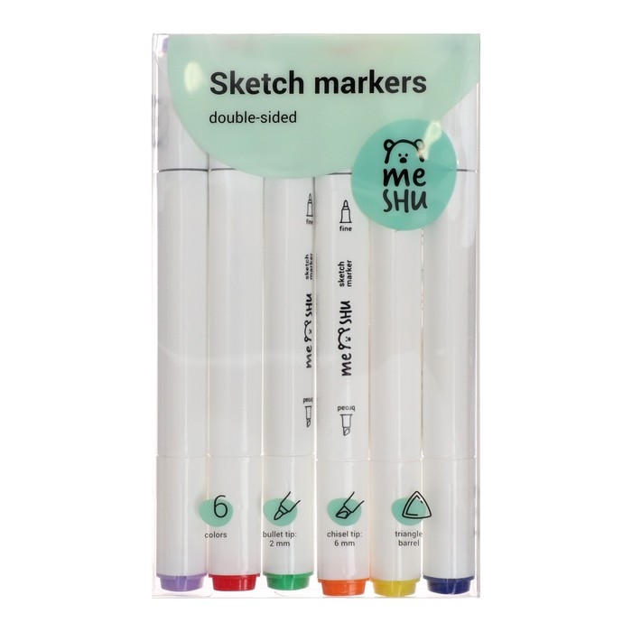 Маркеры для скетчинга двусторонние MESHU, 6 цветов (основные цвета)