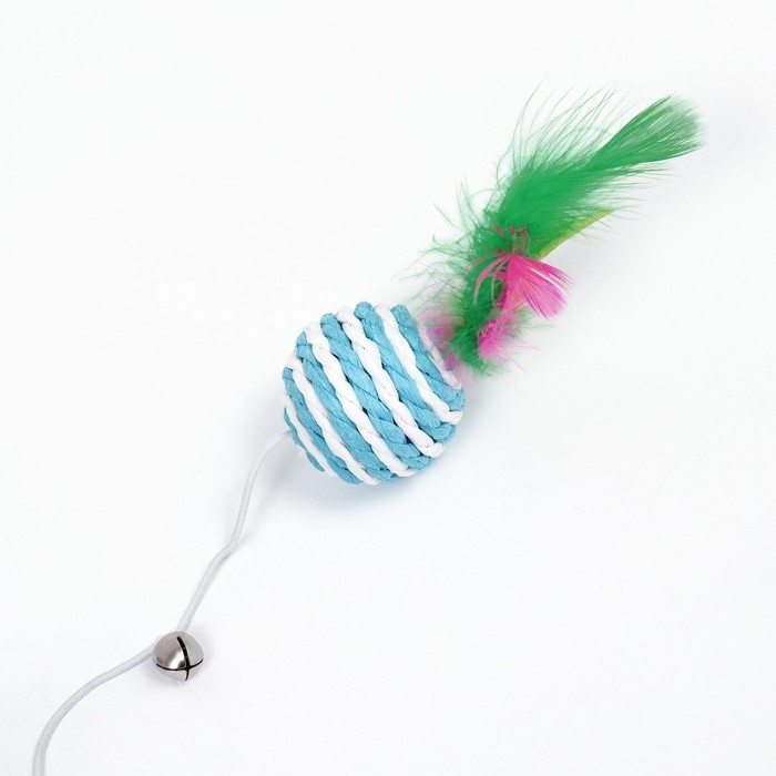 Дразнилка-удочка с плетёным шариком и цветными перьями на деревянной ручке, голубой