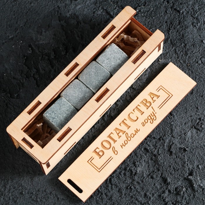 Новый год. Камни для виски в деревянной шкатулке с крышкой «Богатства в Новом году», 4 шт