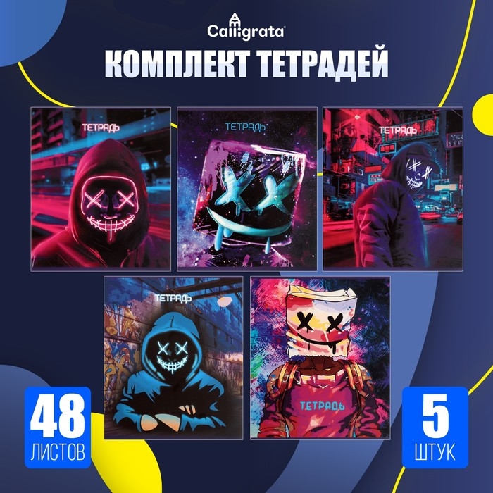 Комплект тетрадей из 5 штук, 48 листов в клетку Calligrata "Маска", обложка мелованный картон, блок офсет