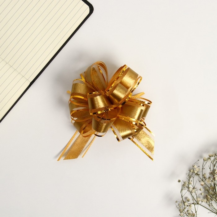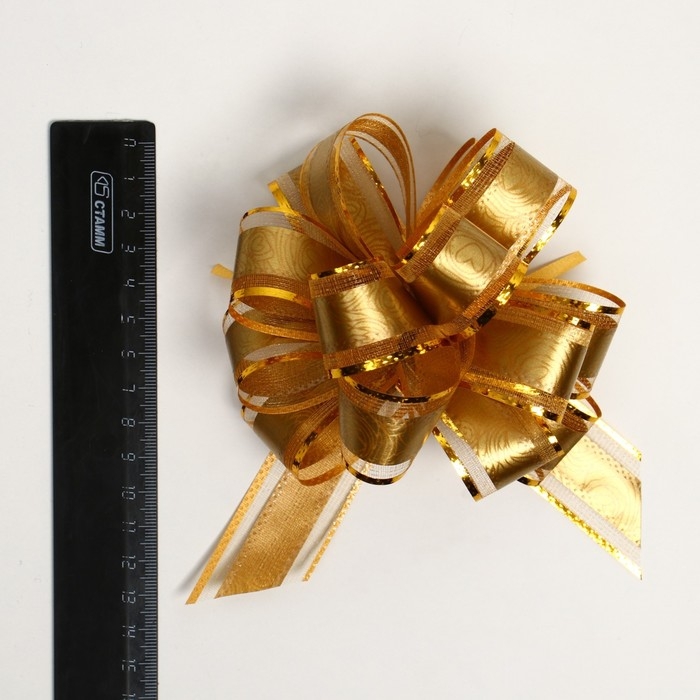 Для того чтобы собрать бант, надо потянуть за две ленточки, находящиеся между широкими лентами, удерживая широкие ленты в месте спайки. Бант собирается за несколько секунд.