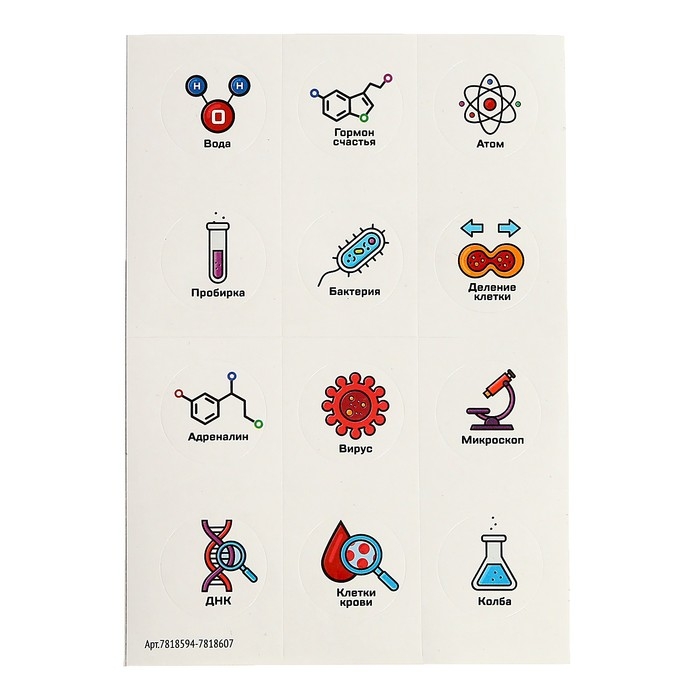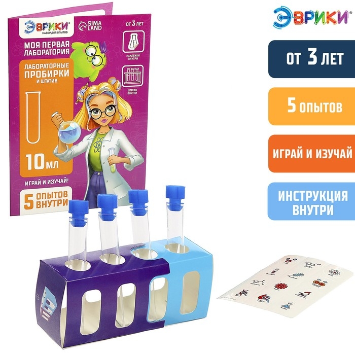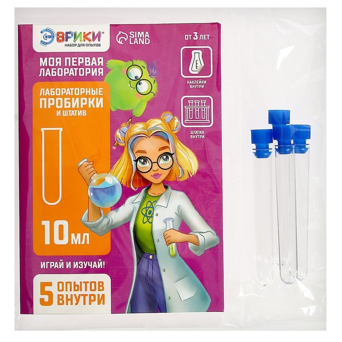 - Набор содержит инструкцию с подробным описанием к 5 экспериментам, лабораторные пробирки, штатив и тематические наклейки.