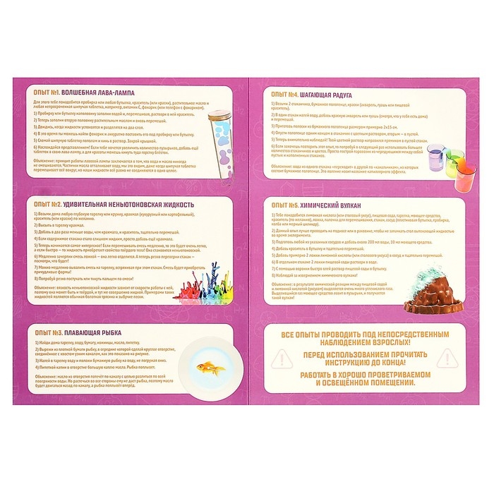 - К каждому опыту приводится список необходимых веществ, пошаговая инструкция и объяснение.