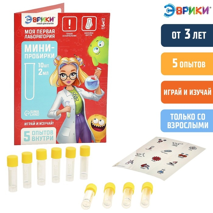 - Набор содержит инструкцию с подробным описанием к 5 экспериментам, мини-пробирки и тематические наклейки.