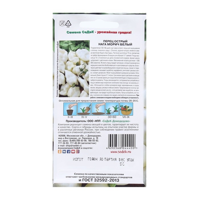 Позднеспелый (130-140 дней) сорт сверх острого перца для выращивания в теплице, относится к виду c. Chinense, родиной которого является северо-восточная Индия и Бангладеш. Растение высотой до 70 см, компактное, не требует формирования. В каждом узле образует 3-7 завязей. Плоды массой до 10 г, от молочного до цвета слоновой кости окраски. Аромат мякоти цитрусовый с цветочными нотами. Максимальная острота достигает 1 000 000 сковиллов. Жгучесть перцу придает капсаицин, который применяется в медицине в качестве обезболивающего и разогревающего средства. Благотворно действует на кровообращение и сердечную мышцу, спасает от переохлаждения и вызывает выработку эндорфинов, уничтожает раковые клетки, снимает депрессию. Может выращиваться в домашних условиях. Оптимальный объем горшка 5-7 литров. Срок жизни одного растения не меньше пяти лет. В зимнее время для продолжения вегетации и плодоношения потребуется досветка. Плоды рекомендуется с осторожностью употреблять в пищу в свежем виде незрелыми (зелеными) пока они еще «не налились огнем». Используется в любом кулинарном виде: маринованными, в соусах, маслах, овощных, рисовых и мясных смесях. Предупреждение: если вы чувствуете сильную жгучесть во рту, и это доставляет вам неудобство, не запивайте водой, она придаст ещё больше остроты. Лучше употреблять этот перец с молоком или сливками или заедать сметаной или мороженым.