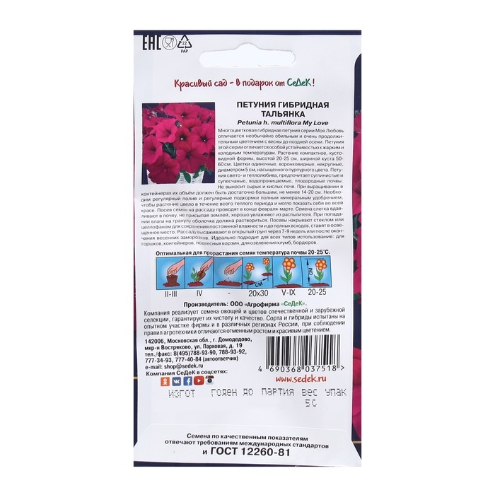 Многоцветковая гибридная петуния серии Моя Любовь отличается необычайно обильным и очень продолжительным цветением с весны до поздней осени. Петуния этой серии отличается особой устойчивостью к жарким и холодным температурам. Растение компактное, кустовидной формы, высотой 20-25 см, шириной куста 50-60 см. Цветки одиночные, воронковидные, некрупные, диаметром 5 см, насыщенного пурпурного цвета. Петуния свето- и теплолюбива, предпочитает суглинистые и супесчаные водопроницаемые плодородные почвы. Не выносит сырых и кислых почв. При выращивании в контейнерах их объём должен быть достаточно большим, не менее 14-20 см. Необходим регулярный полив и регулярные подкормки полным минеральным удобрением, чтобы растение цвело в течение всего теплого периода и могло показать себя во всей красе.