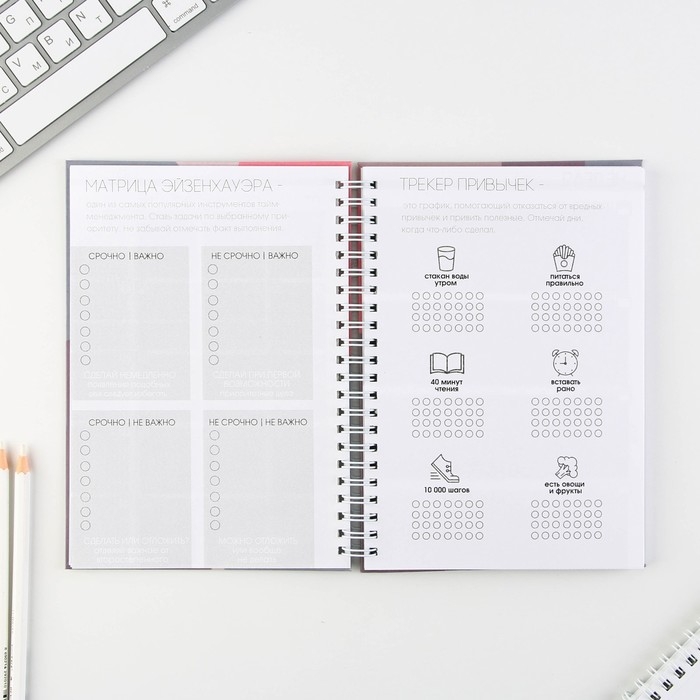 Этот еженедельник поможет тебе в организации планов. Он состоит из 12 разворотов на каждый месяц и 5 разворотов на неделю.