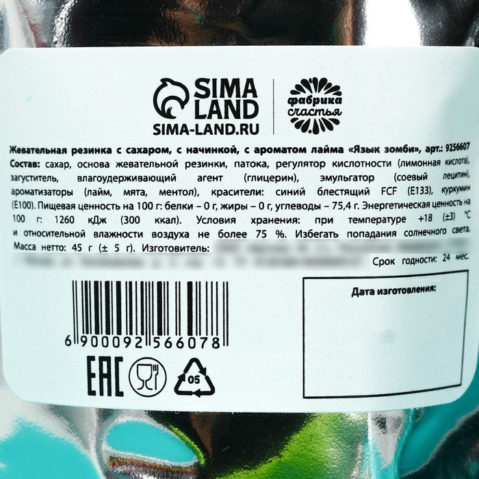Состав: сахар, основа жевательной резинки, патока, регулятор кислотности (лимонная кислота), загуститель, влагоудерживающий агент (глицерин), эмульгатор (соевый лецитин), ароматизаторы (лайм, мята, ментол) краситель: синий блестящий FCF (Е133), куркумин (Е100).
