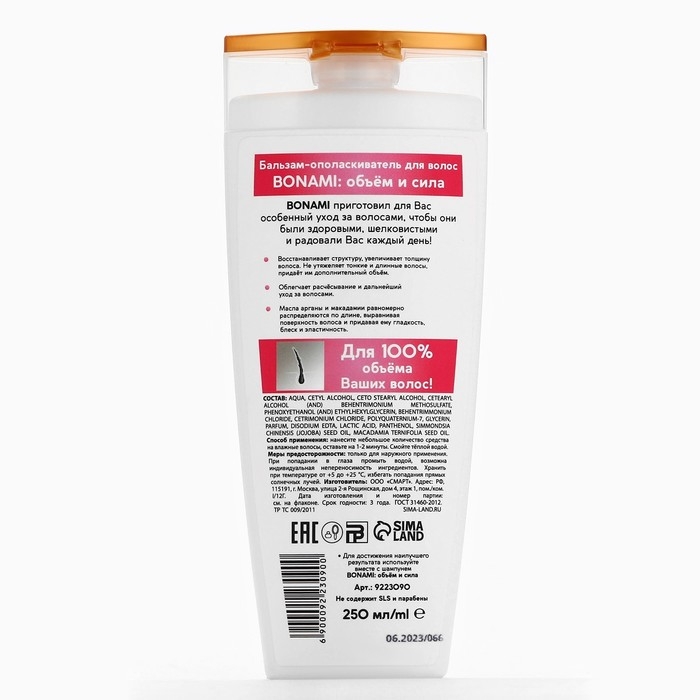 Бальзам для ослабленных волос с маслом аграны и макадамии, объём и сила, 250 мл, BONAMI
