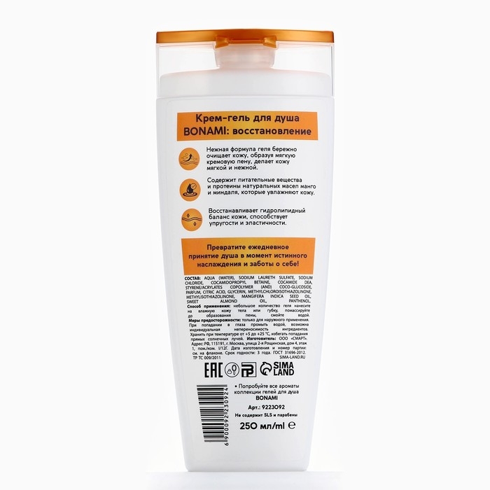 Гель для душа с пантенолом, восстановление, 250 мл, аромат манго и миндаля, BONAMI