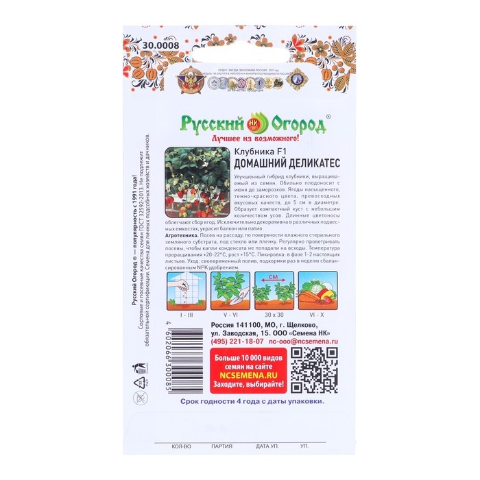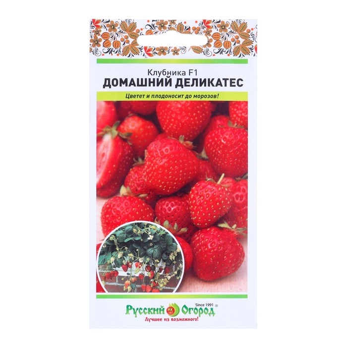Клубника Домашний деликатес F1 - это компактный садовый гибрид, который можно вырастить из семени в компактный округлый куст с минимальным количеством усов и длинными цветоносами, что облегчает сбор ягод. Ремонтантные свойства растения обеспечивают его плодоношение вплоть до заморозков. Ягоды до 3 см в диаметре и весом 20-40 г, округлые, насыщенно красные и очень вкусные. Январь-март – время посева клубники на рассаду по поверхности увлажненного стерильного субстрата, который затем закрывается пленкой или стеклом. Посев регулярно проветривают. Проращивают семена при температуре в 20-22 градуса. Для дальнейшего роста куста достаточно 15 градусов. При появлении 1-2 настоящих листьев, клубнику пикируют. Растение следует вовремя поливать, не допуская пересыхания земли. Необходима ежедневная подкормка NPK удобрениями.