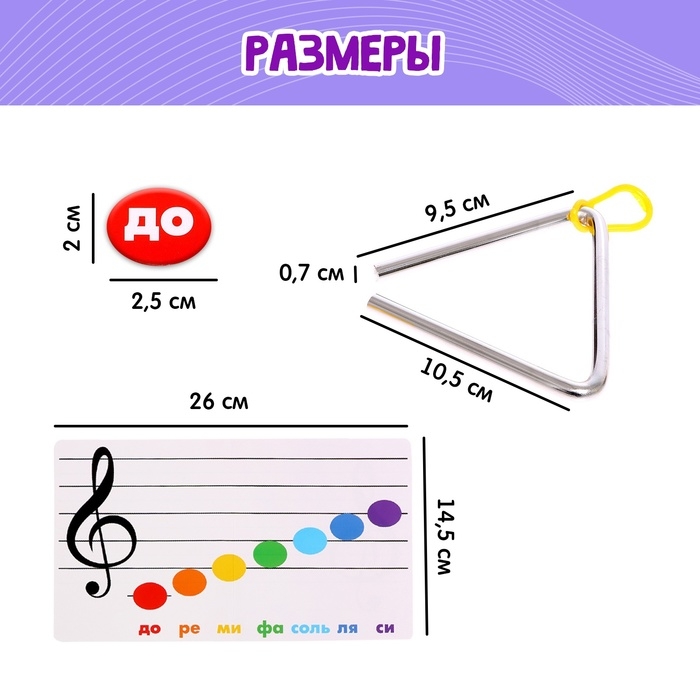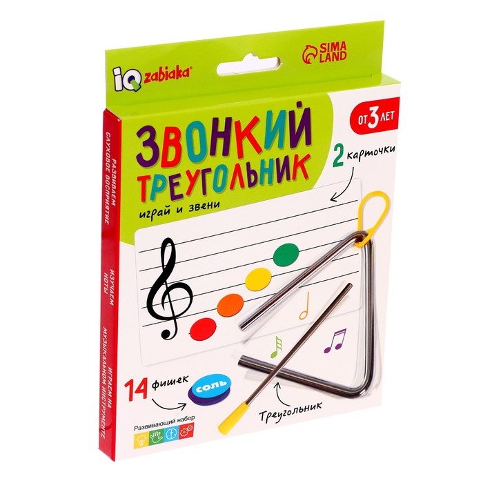 Развивающий набор «Звонкий треугольник» познакомит малыша с миром музыки и основами нотной грамоты. Внутри вы найдёте музыкальный треугольник, палочку, 2 карточки и набор фишек с названием нот.