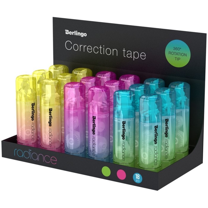 Исправление ошибок стало проще и стильнее с корректирующей лентой Berlingo Radiance. Этот незаменимый офисный аксессуар отличается современным дизайном корпуса с градиентом, привлекающим внимание и добавляющим яркости вашему рабочему месту.