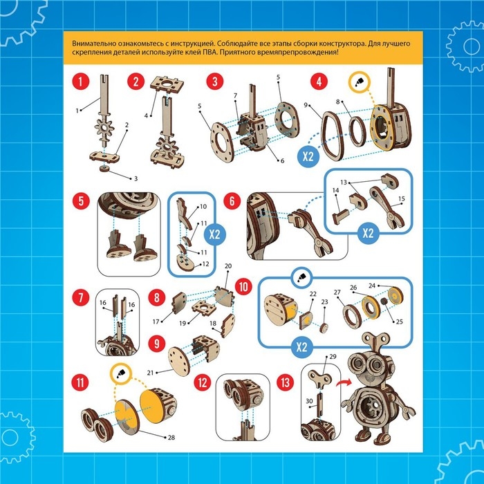 - Для надёжности крепления деталей можно использовать клей ПВА (в комплект не входит).