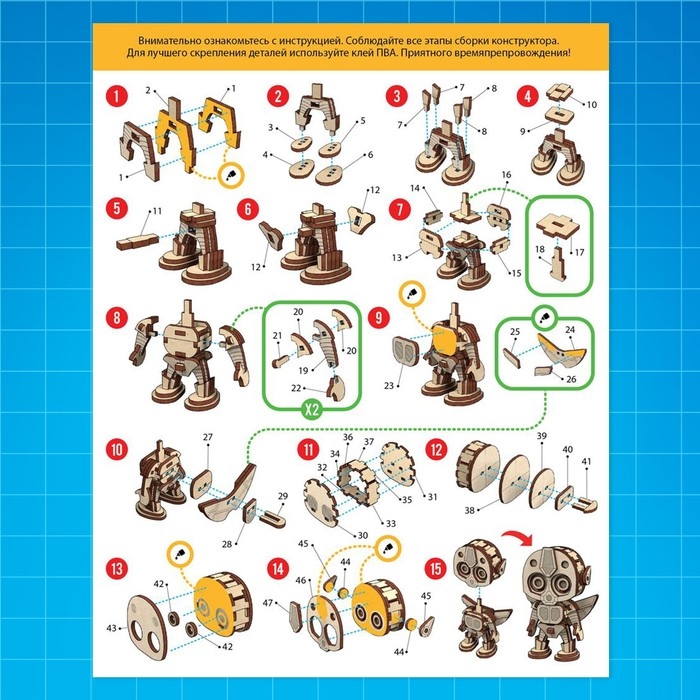 - Для надёжности крепления деталей можно использовать клей ПВА (в комплект не входит).