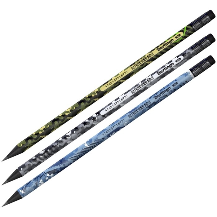 Карандаш чёрнографитный Berlingo "Military", HB, круглый, с ластиком, чёрное дерево, заточенный