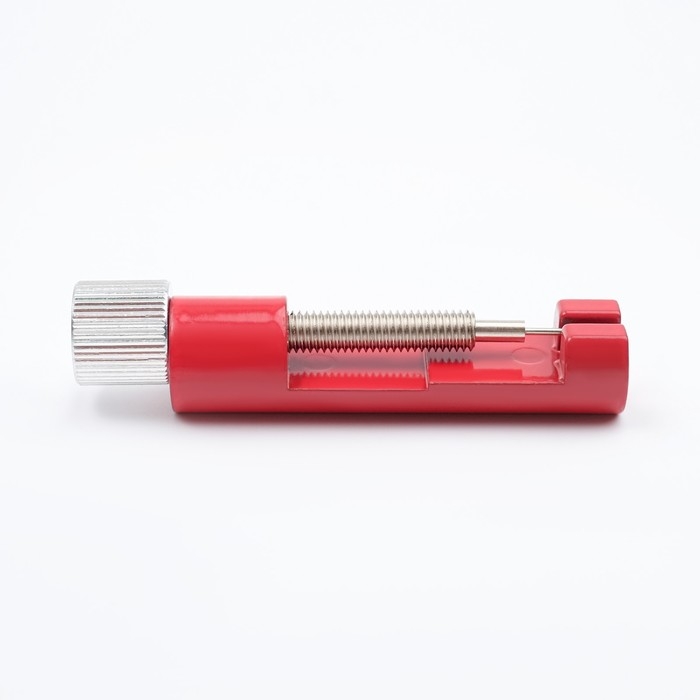 Воспользовавшись инструментом для снятия звеньев браслета часов, вы сэкономите время и деньги на поход в часовую мастерскую. Вся процедура займет не более 10 минут. Положите браслет от ваших часов в выемку съемника, так чтобы звено ремешка было напротив штифта, а обратная сторона звена выходила в специальное отверстие на приборе и начните медленно закручивать винт, выкрутите винт полностью, после чего воспользовавшись пассатижами аккуратно вытащите штифт, далее закрутите винт обратно в инструмент для укорачивания браслета.