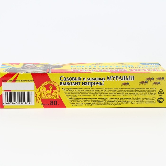 Как избавиться от докучающих на участке и даче садовых муравьев? Что бы с ними не делали — они через несколько дней появляются снова. Ситуация кардинально меняется благодаря новому средству «Великий Воин — гель против садовых муравьев». Этот гель — приманка с двумя веществами, губительными для муравьев. Специальный состав ее так привлекателен для насекомых, что рабочие особи не только охотно поедают ее сами, но приносят в муравейник и кормят личинок. Благодаря этому уже через несколько дней погибает вся муравьиная колония. Пригодится Вам гель «Великий Воин» и в борьбе с домовыми муравьями.