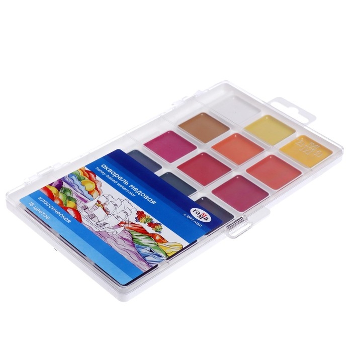 Акварель безопасна для детей. Удобный пластиковый пенал, крышка плотно фиксируется и служит палитрой для смешивания красок.