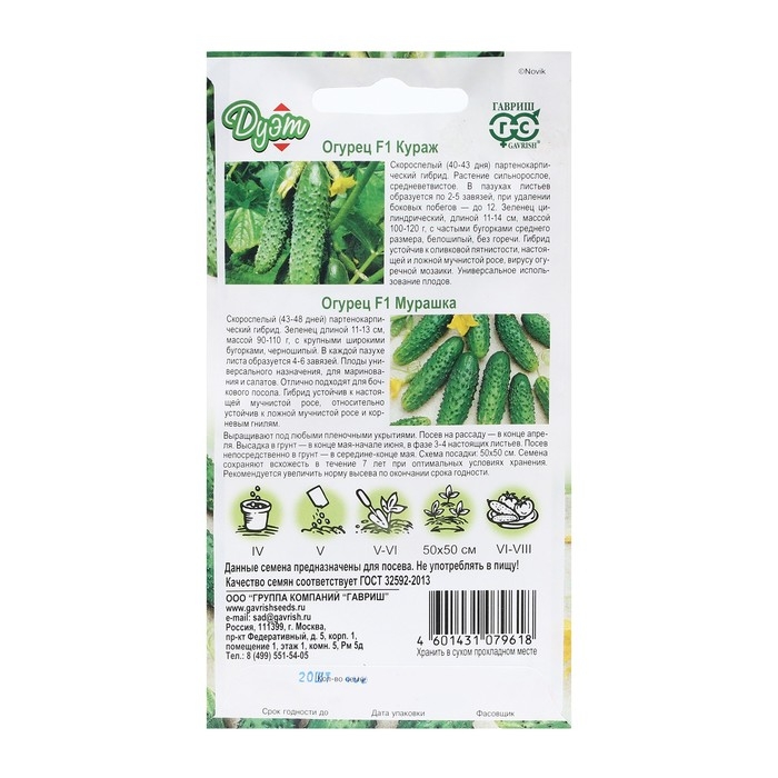 Семена огурцов "Кураж"Этот сорт огурцов гарантирует обильный урожай ароматных, хрустящих плодов насыщенно-зелёного цвета. Растение отличается повышенной устойчивостью к заболеваниям и неблагоприятным погодным условиям. Плоды "Кураж" имеют идеальную форму, бугорчатую текстуру и тонкую горьковатую кожицу, которая сохраняет свежесть и хрустящую консистенцию даже при длительном хранении. Огурцы "Кураж" прекрасно подходят как для свежего потребления, так и для консервирования. Их можно использовать в салатах, для заготовок на зиму, а также для фаршировки и приготовления различных блюд.Семена огурцов "Мурашка"Этот сорт поражает своей урожайностью и скороспелостью. Растение отличается компактными размерами и обильным плодоношением. Плоды "Мурашка" небольшого размера, тёмно-зелёного цвета с белыми полосками. Они идеально подходят для консервирования и малосольных заготовок. Огурцы "Мурашка" обладают насыщенным вкусом с лёгкой кислинкой и отменной хрустящей текстурой. Благодаря высокой устойчивости к болезням и вредителям, этот сорт прекрасно подойдёт для выращивания в открытом грунте и в теплицах.Серия "Дуэт" - это коллекция отборных сортов огурцов с великолепными вкусовыми качествами и высокой урожайностью. Семена "Кураж" и "Мурашка" гарантируют обильный и длительный сезон свежих овощей на вашем столе!