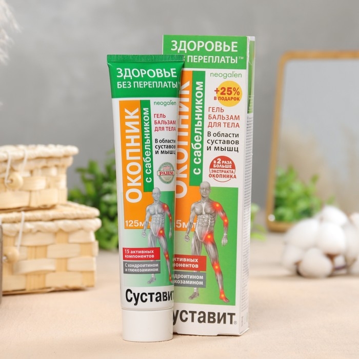 Гель-бальзам для тела "Суставит Окопник" с сабельником предупреждение заболеваний суставов и позвоночника при наличии факторов риска (малоподвижный образ жизни, наследственная предрасположенность, повышенная нагрузка на суставы, переохлаждение, вирусные инфекции, хронические воспалительные заболевания.