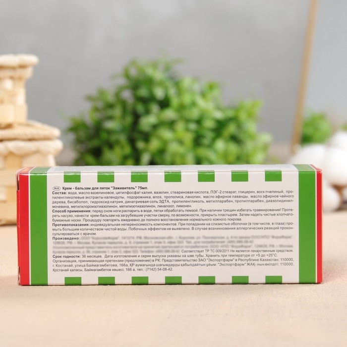 Крем-бальзам для пяток ЗАЖИВИТЕЛЬ смягчающий -эффективное натуральное средство на основе природных компонентов. Смягчает, увлажняет и выравнивает кожу стоп, устраняет загрубение и пересыхание кожи, натоптыши и трещины на пятках. Здоровые ухоженные пятки должны быть в любом возрасте гладкими и мягкими. Однако у большинства людей с годами кожа ступней грубеет, на ней появляются натоптыши (утолщение рогового слоя кожи - омертвление рогового слоя кожи), мозоли. На пятках нередко возникают трещины в результате механических повреждений (тесная обувь, синтетические носки и колготки, хождение босиком), а также вследствие нарушения обмена веществ, плохого кровоснабжения стоп, дефицита витаминов А и Е. Любые нарушения нормального кожного покрова на ступнях вызывают ощущение дискомфорта, боль, являются косметическим дефектом и серьёзным фактором риска возникновения грибковых заболеваний.