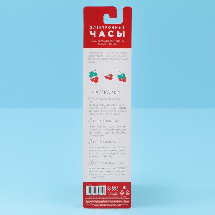 Электронные часы с ремешком-конструктором станут ярким аксессуаром вашего ребенка, съемные ремешки позволят скорретировать нужную длину (инструкция по сборке расположена на обороте упаковки). Часы показывают число, время и месяц.
