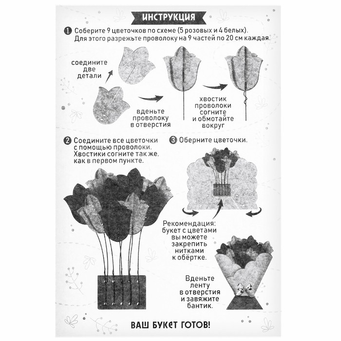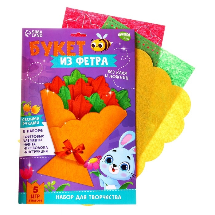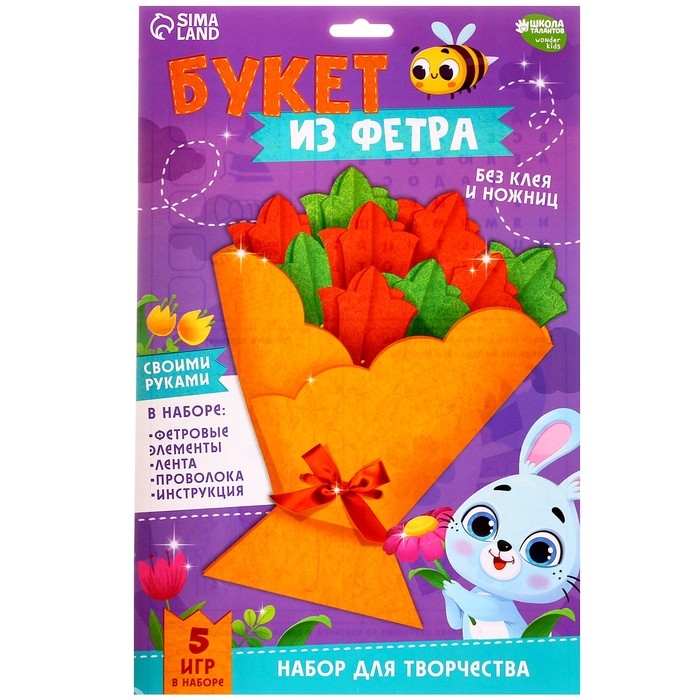 В набор входят фетровые элементы, лента, проволока и инструкция. Малышу достаточно сложить уже вырезанные элементы по инструкции, вставить проволоку, а затем сформироватть цветочки и замечательный подарок готов! Открытку можно подарить близкому человеку.