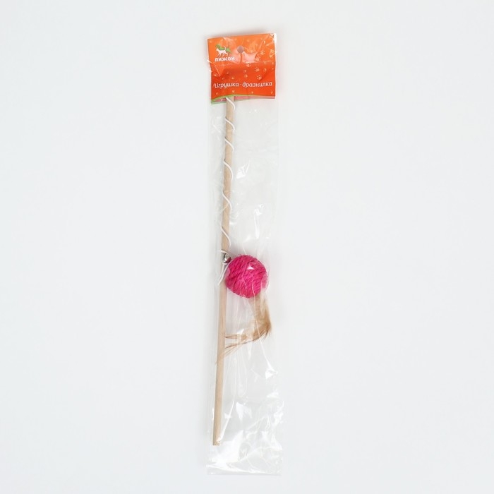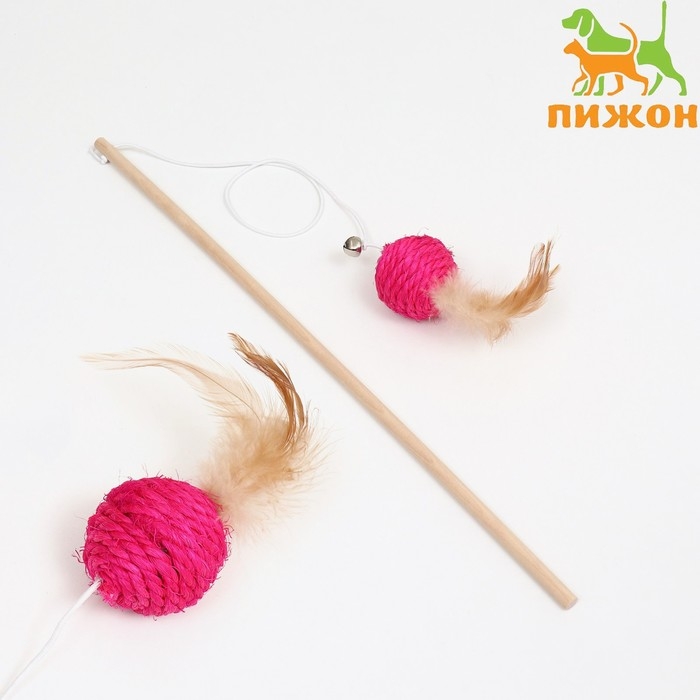 Дразнилка "Сизалевый шар" с перьями и бубенчиком, на деревянной ручке, 40 см, розовый шар