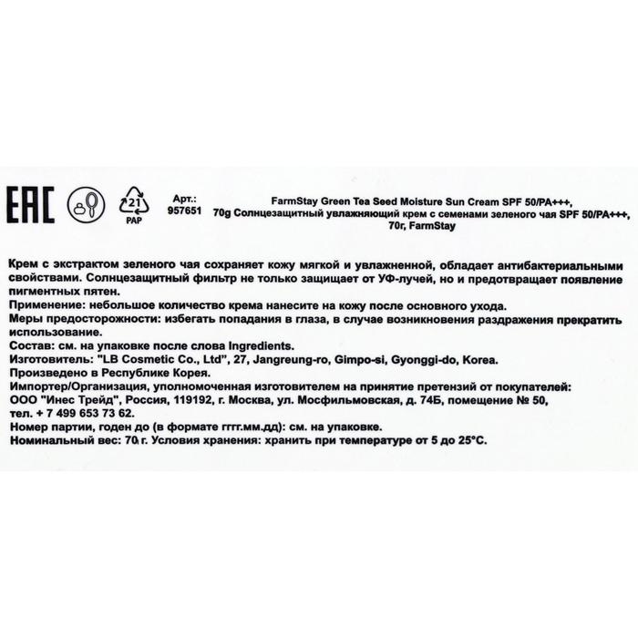 Солнцезащитный крем для тела FarmStay SPF 50/PA+++, увлажняющий, 70 г