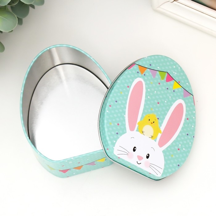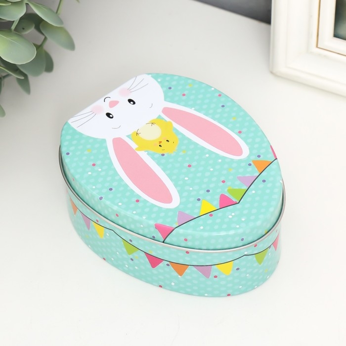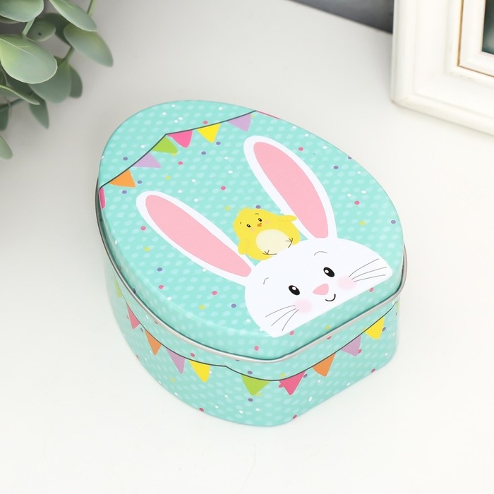 Шкатулка металл яйцо "Цыплёнок на голове у зайчика" 11,7х9,2х4,5 см
