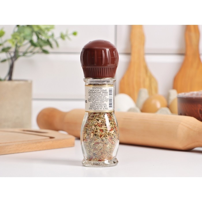 Её секрет в букете из шести пряностей, подобранных особым образом, где доминируют розмарин, базилик и орегано, а дополняют их паприка, тимьян и чёрный перец. Итальянские травы идеальная заправка для разнообразных салатов, пиццы, пасты, лазаньи, мясных, рыбных и овощных блюд, супов и бульонов, омлетов и запеканок, брускетты, различной выпечки. Добавление морской соли к пряностям делает использование мельницы особенно удобным.
