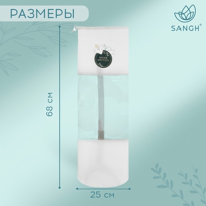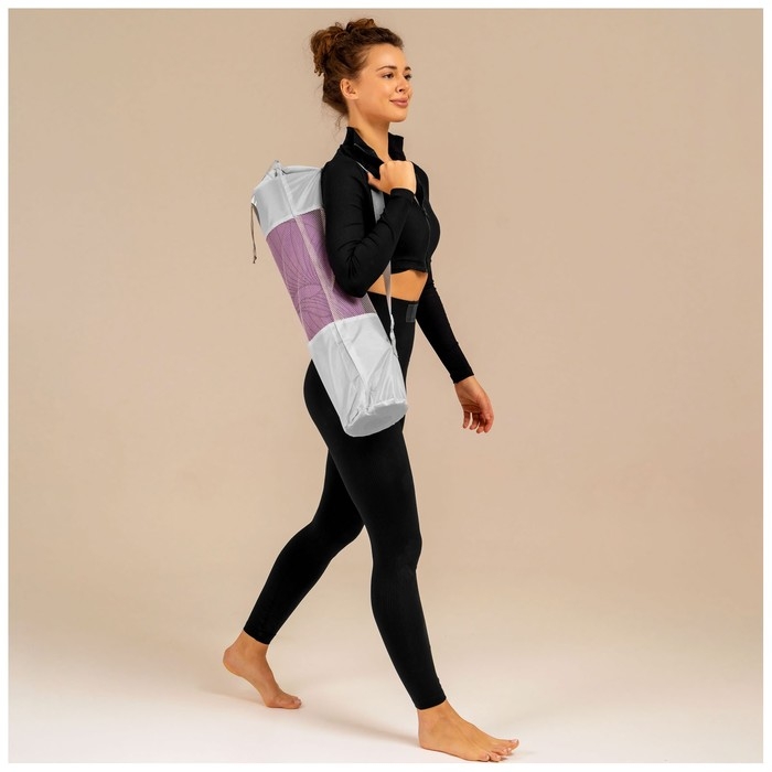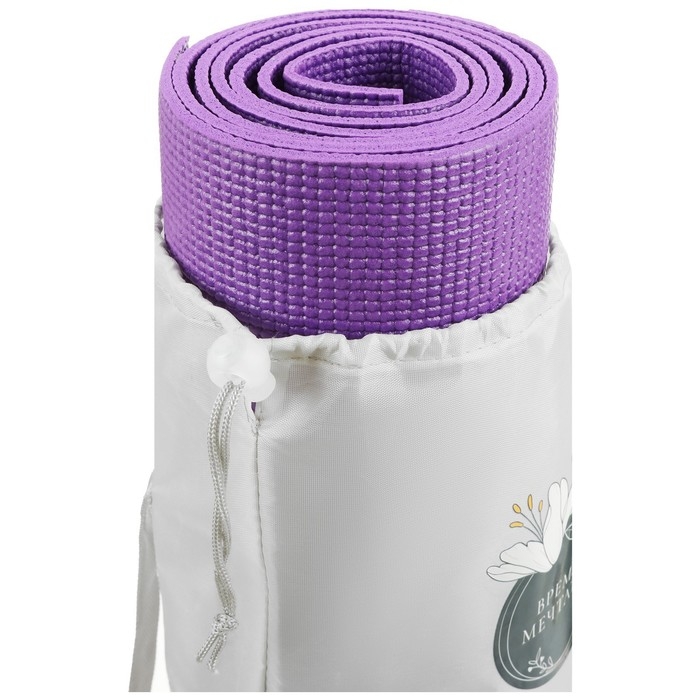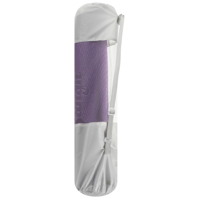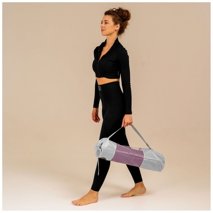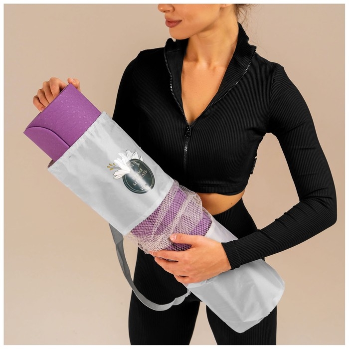 Чехол предназначен для хранения и транспортировки коврика для йоги. Чехол защищает коврик от грязи и пыли. Имеет ремень для носки через плечо, который регулируется по длине. Сверху чехол затягивается верёвочкой, чтобы коврик не выпал. Верёвочка фиксируется пластиковой клипсой.