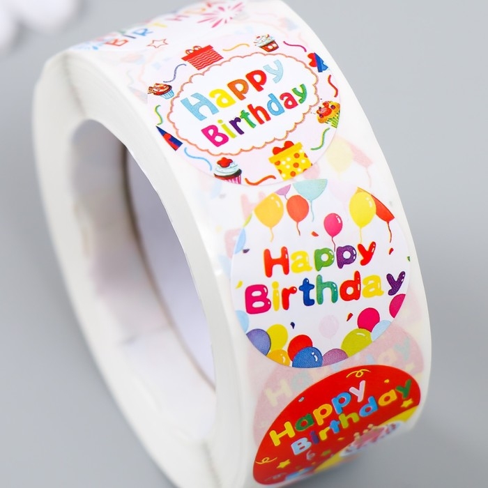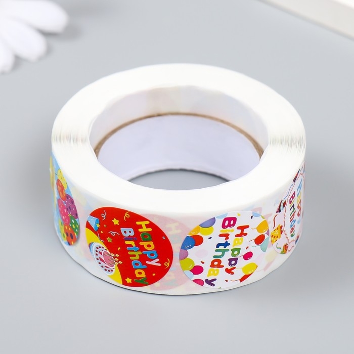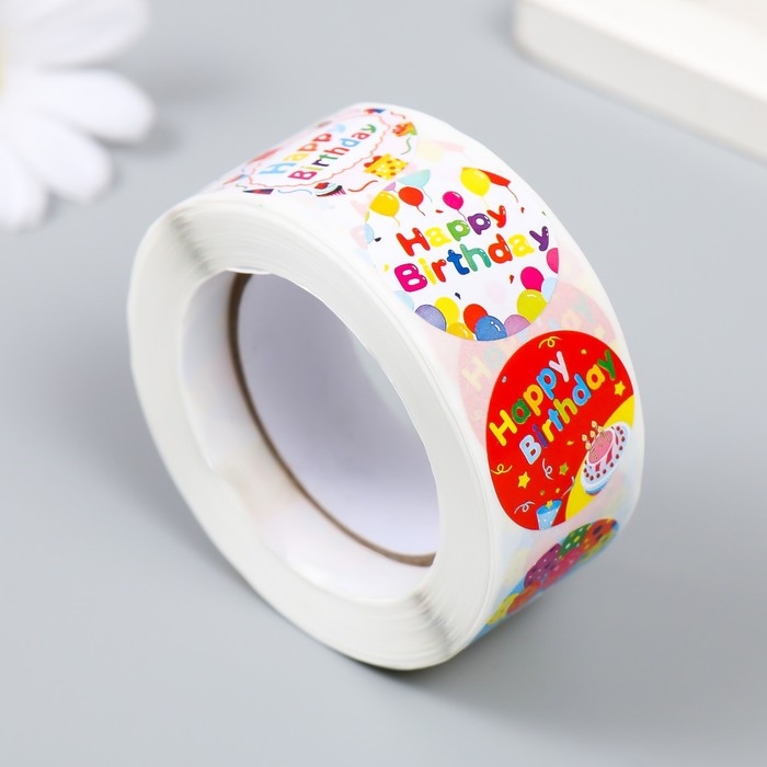 Наклейка бумага "С днём рождения!" d=2,5 см 500 шт в рулоне 3х6,5х6,5 см