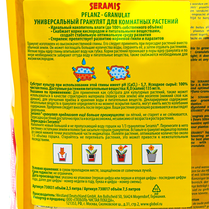 Особенности: растения роскошно развиваются и выглядят здоровыми. Seramis - гранулят предлагает ещё больше преимуществ: он лёгкий, не стареет и не слёживается, предотвращает грибного комарика. Пересадка растений достаточно простая и всегда возможна, независимо от возраста и роста растения.