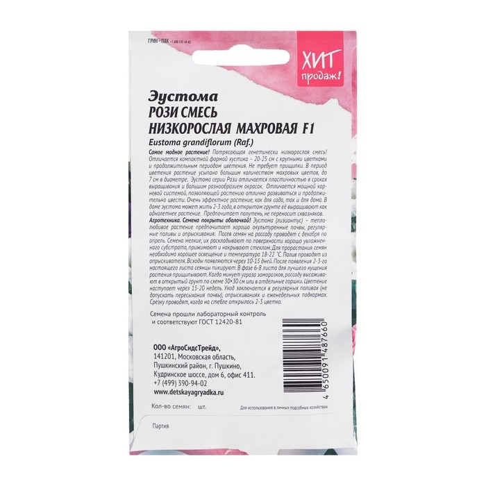 Агротехника: Семена покрыты оболочкой! Эустома (лизиантус) – однолетнее, теплолюбивое растение, предпочитает хорошо окультуренные почвы, регулярные поливы и опрыскивания. Посев семян на рассаду проводят с декабря по апрель. Семена мелкие, их раскладывают по поверхности хорошо увлажненного субстрата, прижимают и накрывают стеклом. Для прорастания семян необходимо хорошее освещение и температура 18-22С. Полив проводят из опрыскивателя. Всходы появляются через 10-15 дней. После появления 2-3-го настоящего листа сеянцы пикируют. В фазе 6-8 листа для лучшего кущения растения прищипывают. Когда минует угроза заморозков, рассаду высаживают в открытый грунт по схеме 30×30 см или в отдельные горшки. Цветение наступает через 15-20 недель. Уход заключается в регулярных поливах (не допускать пересыхания почвы), опрыскиваниях и еженедельных подкормах. Срезку проводят, когда на стебле открылось 2-3 цветка.