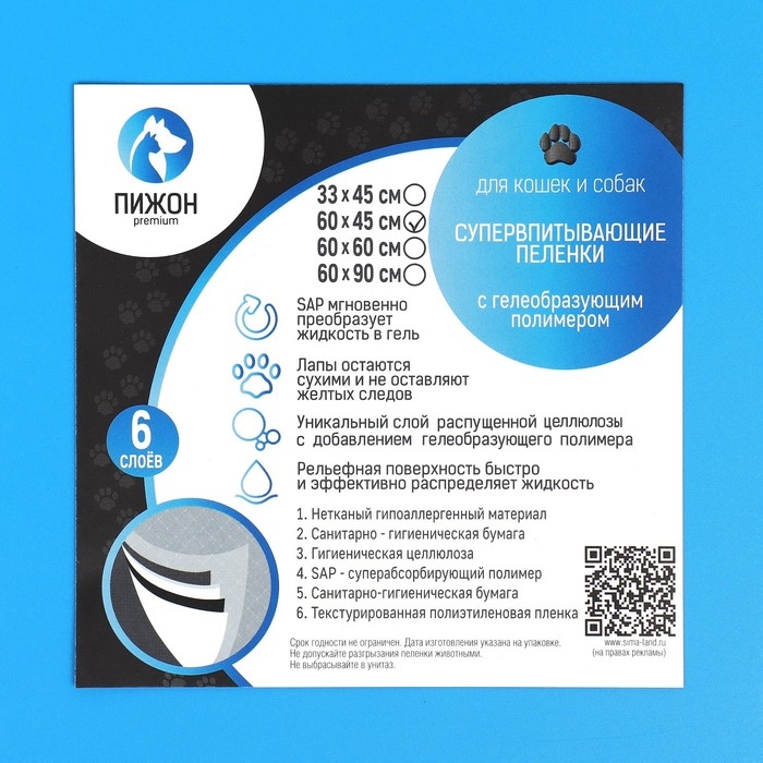 Пеленки быстро впитывающие "ПИЖОН" для животных гелевые, 60 х 40 см (в наборе 5 шт)