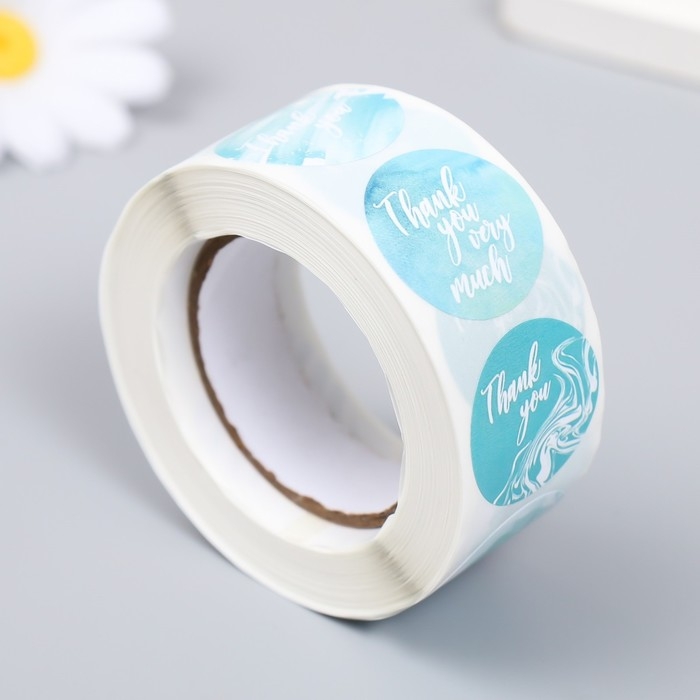 Наклейка бумага "Голубой туман. Благодарность" d=2,5 см 500 шт в рулоне 3х6,5х6,5 см