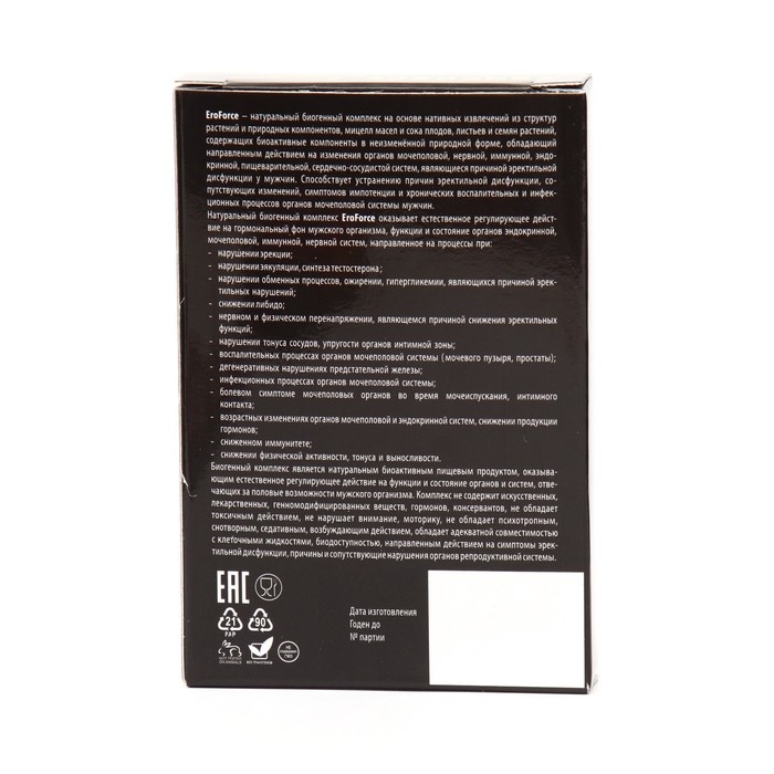 EroForce – натуральный биогенный комплекс на основе нативных извлечений из структур растений и природных компонентов, мицелл масел и сока плодов, листьев и семян растений, содержащих биоактивные компоненты в неизменённой природной форме, обладающие направленным действием на изменения органов мочеполовой, нервной, иммунной, эндокринной, пищеварительной, сердечно-сосудистой систем, являющиеся причиной эректильной дисфункции у мужчин.